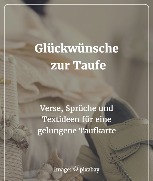 Die schönsten Glückwünsche zur Taufe Inhalt Bei einer Taufe handelt es sich um einen christlichen Brauch, welcher bereits seit dem neuen Testament ausgeführt wird. "Das ein Glückwunsch zur Taufe nicht zwingend ein Zitat aus der Bibel sein muss, zeigt die Großzahl an weltlichen Sprüchen, die wir ebenfalls in unsere Spruchsammlung zur Taufe aufgenommen haben Bei einigen dieser Sprüche lässt sich zwar ein grober Bezug zum Glauben oder zu Gott erahnen, andere sind jedoch komplett frei davon und trotzdem. Glückwünsche zur Geburt und der Taufe Die Ankunft eines neuen Erdenbürgers ist ein ganz besonderes Ereignis, darum sollten Glückwünsche zur Geburt auch aus tiefstem Herzen kommen das innere Empfinden ausdrücken Hier finden Sie eine Vielzahl herzlicher Grüße in diversen Stilen und Formulierungen.