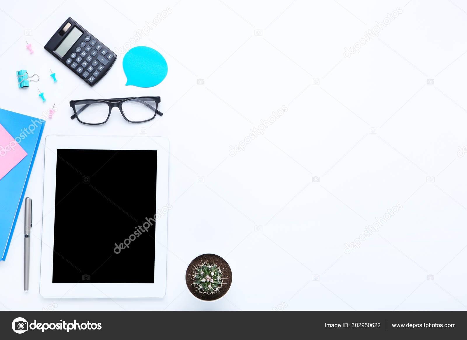 Tablet Computer Mit Burobedarf Auf Weissem Hintergrund Stockfoto C 5seconds