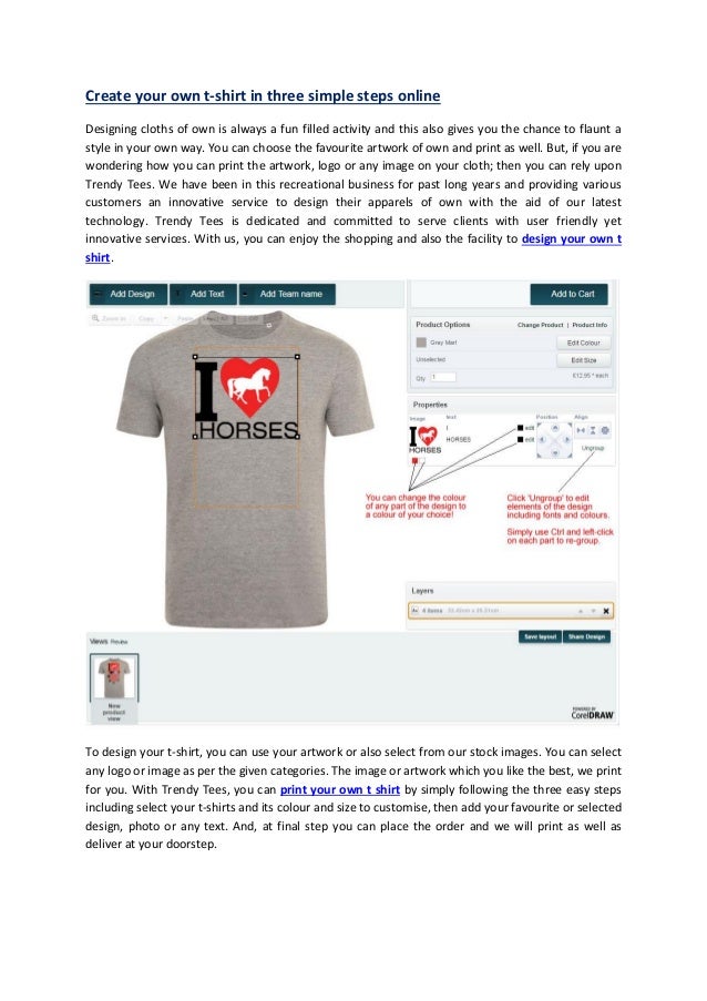 Shop highquality unique Make Your Own TShirts designed and sold by artists Available in a range of colours and styles for men, women, and everyone. Lay your tshirt on a flat surface Make sure there are no wrinkles Place the screen on top of the tshirt, where you would like your design to be Place the screen on top, making sure that the screen and design are aligned Clip your shirt down to a firm piece of cardboard Doing this will ensure your tshirt remains flat and unwrinkled. Design your own tshirts online At CreateAShirtcom, our goal is to deliver custom tshirts to you as fast and cheap as we can Our free online tshirt designer makes it easy to make that perfect tshirt design for your group, team or event Pick your exact delivery date on the checkout page and we'll do the rest.
