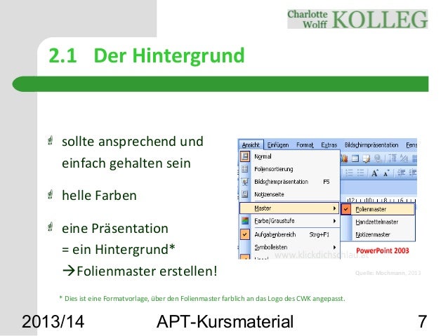 Ich bin momentan dabei die PowerPointPräsentation zu meiner Seminararbeit zu gestalten und frage mich nun, wie es da genau mit den Quellenangaben läuft, da wir dazu keine genauen Materialien haben Dass am Ende alle Quellen auf einer separaten Folie aufgelistet werden und jedes Bild eine Quelle mit Abbildungsverzeichnis bekommt, ist mir klar. Mit der Quellenangabe verweisen Sie zu dem Ort, an dem sich das Originalbild befindet Weiterhin sollten Sie neben der URL auch das Datum des letzten Zugriffs nennen Bei mehreren Bildquellen nummerieren Sie die einzelnen Quellen Bilder oder Grafiken aus dem Internet können von Zeit zu Zeit gelöscht werden oder Webseiten existieren nicht mehr. 2 Inhalt und Gliederung einer Präsentation 1 21 Inhalt 1 22 Niveau 3 23 Zeitliche Planung 4 24 Gliederung 4 3 Hilfsmittel bei einer Präsentation 5 31 Slides 5 32 Schrift 6 33 Aufzählungen 7 34 Übersichten in Raum und Zeit 7 35 Farben 8 36 Graphiken und Animationen 8 37 Handouts 10 38 Software 10 4 Der Vortrag 11 41 Probevortrag.